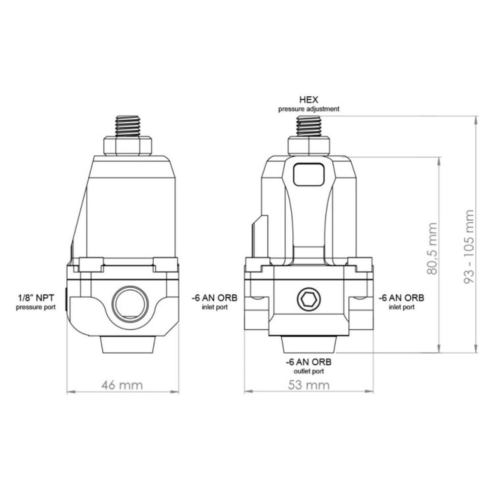 Dieser Kraftstoffdruckregler wurde in Zusammenarbeit mit weltweiten Motorsportteams und Kraftstoffpumpenherstellern entwickelt und ist so eingestellt, dass er unter allen Bedingungen und für alle Leistungsanforderungen funktioniert. Er ist für den Einsatz weit über 1000 PS ausgelegt und getestet und ist voll einstellbar zwischen 2 und 7 Bar (100 Psi). Dies ist der beste -06 AN / Dash 6 Kraftstoffdruckregler mit der höchsten Durchflusskapazität.