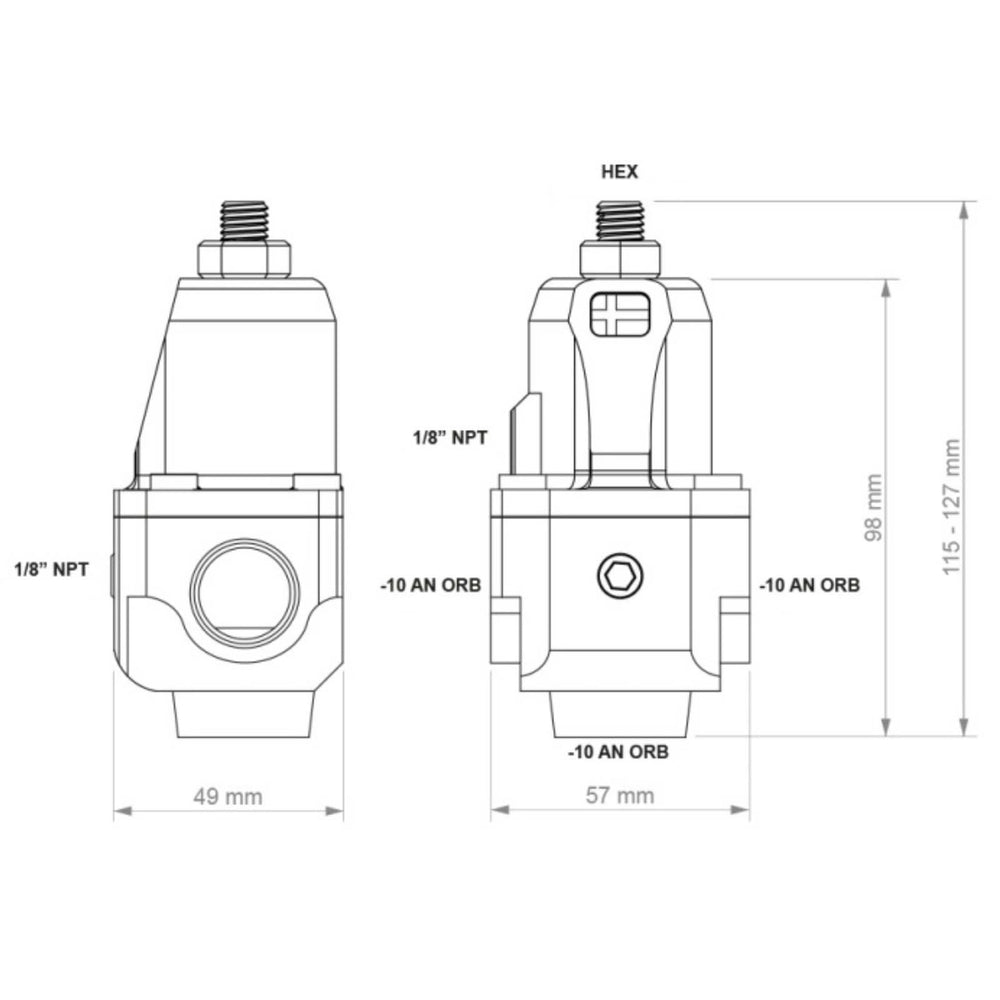 Dieser Kraftstoffdruckregler wurde in Zusammenarbeit mit weltweiten Motorsportteams und Kraftstoffpumpenherstellern entwickelt und ist so eingestellt, dass er unter allen Bedingungen und für alle Leistungsanforderungen funktioniert. Er ist für den Einsatz weit über 2000 PS ausgelegt und getestet und ist voll einstellbar zwischen 2 und 7 Bar (100 Psi). Dies ist der beste -10 AN / Dash 10 Kraftstoffdruckregler mit der höchsten Durchflusskapazität.