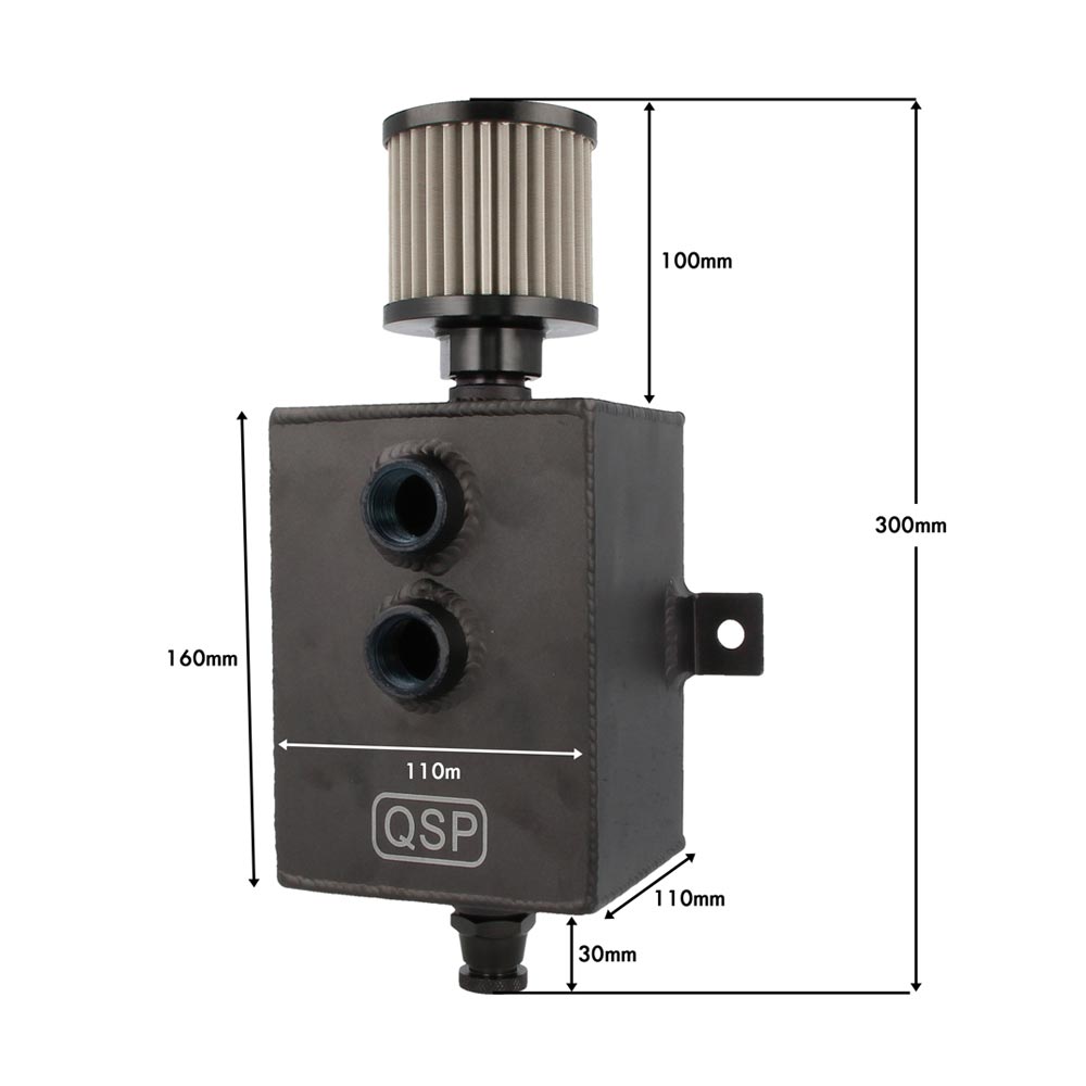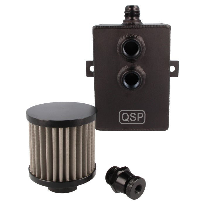 Der QSP Öl Catchtank mit 2Liter Fassungsvolumen ist mit Schwallwänden im Inneren und einem kleinen Ölfilter ausgestattet. Der kompakte Tank hat zudem als Durchlass zwei weibliche Dash 10 / AN10 (7/8-14 UNF) Anschlüsse.