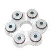 Die Hardyscheibe von SILVERPROJECT ist aus Aluminium gefertigt und hält selbst außergewöhnlichen Belastungen stand. Die Lager aus PU sorgen dabei für eine ähnlich direkte Kraftübertragung wie bei Hardyscheiben aus Vollmaterial, können jedoch besonders hohe Drehmomentstöße noch abfangen und schonen somit den gesamten Antrieb.