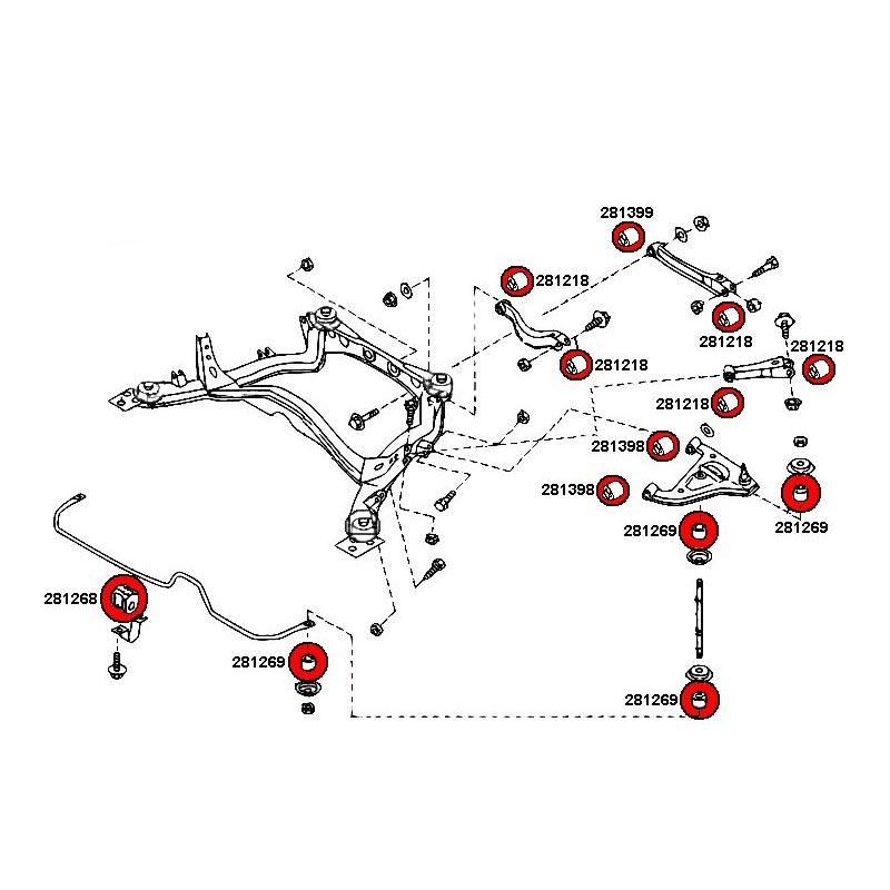 Hinweis: Das Buchsen-Set mit 80ShA (Rot) ist, Aufgrund der Fahreigenschaften vom Nissan S14, teilweise auch mit 90ShA(gelb) Buchsen kombiniert.