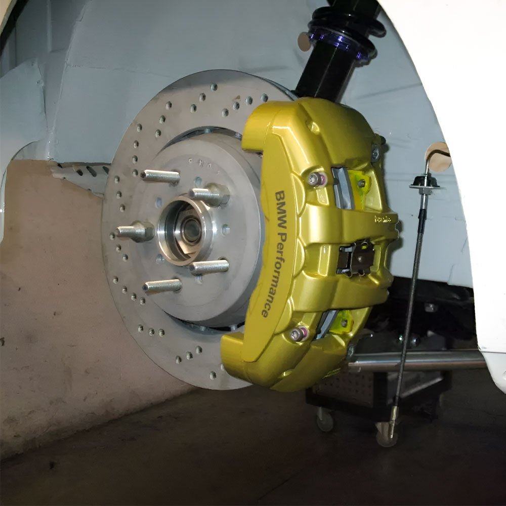 Mit diesen Bremssatteladaptern kannst du die Vorderachse deines BMW E30 mit der Radnabe des BMW E36/E46 zur Montage der BMW E46 M3 Performance Bremsanlage mit 345x28 mm Bremsscheiben und 6-Kolben-Bremssätteln umrüsten. Dabei wird die Spur pro Seite um ca. 20 mm breiter.