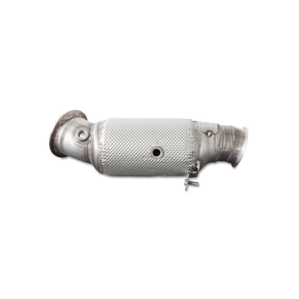 Die Downpipe wird aus hochwertigem Edelstahl gefertigt und mit der bewährten Kalotten-Thermoisolierung aus dem Motorsport ummantelt. Diese Konstruktion schützt umliegende Bauteile vor Hitzeschäden und verbessert gleichzeitig die Abgasführung im Turbolader. Der Lader wird spürbar entlastet, erreicht schneller den vollen Ladedruck und ermöglicht so eine verbesserte Leistungsentfaltung. Auch klanglich profitiert dein BMW: Der Metallträger im Katalysator erzeugt einen sportlich-sonoren Sound – kernig, aber nicht aufdringlich.