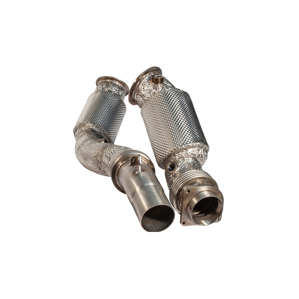 Die Downpipes bestehen aus hochwertigem Edelstahl, sind Plug & Play montierbar und verfügen über eine motorsporterprobte Thermo-Integral-Isolierung. Diese schützt umliegende Komponenten vor Hitzeschäden und sorgt gleichzeitig für einen verbesserten thermischen Wirkungsgrad im Abgassystem. Der Turbolader wird spürbar entlastet, erreicht schneller den optimalen Ladedruck und steigert die Agilität des Fahrzeugs. Gleichzeitig erzeugt der Metallkatalysator einen sportlich-markanten Sound – kraftvoll, aber nicht aufdringlich.