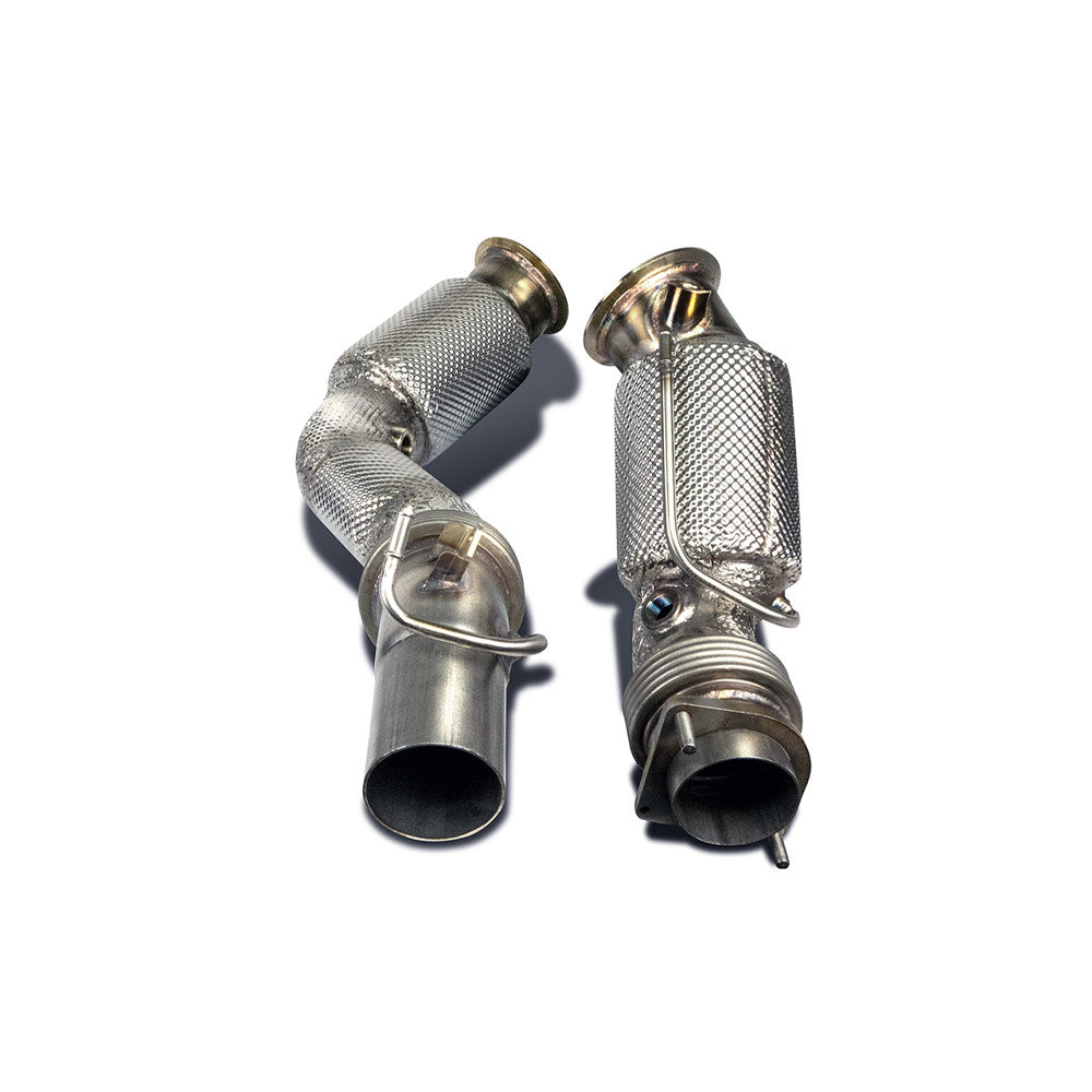 Die aus hochwertigem Edelstahl gefertigten Downpipes sind integralisoliert und verfügen über eine motorsporterprobte Kalotten-Isolierung. Zwei Metallträger mit Ø 105 mm und ein strömungsoptimierter Eingangsbereich verbessern die Anströmung des Katalysators – für maximale Effizienz im Abgassystem. Der Turbolader wird thermisch entlastet, erreicht schneller den Ladedruck und sorgt für ein spürbar direkteres Ansprechverhalten. Auch der Klang profitiert: der metallische Katalysatorträger erzeugt einen sportlich-markanten Sound – druckvoll, aber seriennah.