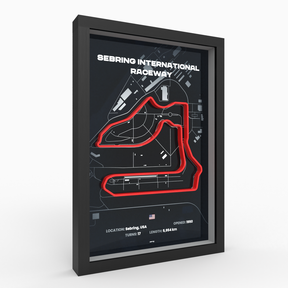 Der Sebring International Raceway gehört zu den traditionsreichsten und anspruchsvollsten Rennstrecken der USA. Bekannt für seine charakteristischen Kurven und unvergesslichen Geraden, hat die Strecke zahlreiche legendäre Rennen hervorgebracht – darunter das berühmte 12-Stunden-Rennen von Sebring. Unser 3D-Poster erfasst jedes Detail dieser Ikone des amerikanischen Motorsports und lässt die Faszination der Strecke in neuem Licht erstrahlen.