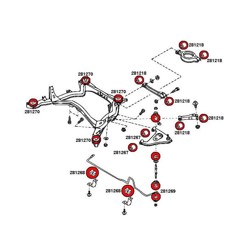 Hinweis: Das Buchsen-Set mit 80ShA (Rot) ist, Aufgrund der Fahreigenschaften vom Nissan Skyline R32 teilweise auch mit 90ShA(gelb) Buchsen kombiniert.