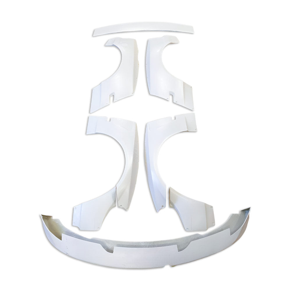 Lieferumfang: 1x Frontlippe, 2x vordere seitliche Stoßstangenteile, 2x vordere Kotflügel, 2x hintere Seitenteile, Ducktail-Spoiler