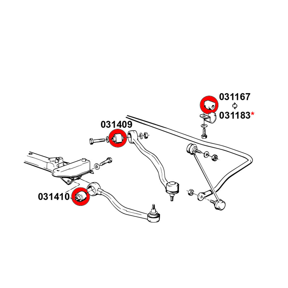 Hinweis: Es gibt bei dem BMW E24 je nach Motorvariante zwei Ausführungen der Stabilisator-Buchse. Wenn du einen 635i hast, dann wähle bitte die Buchse mit der Kennzeichnung 031183 aus, bei allen anderen Motorisierungen bitte die 031167.