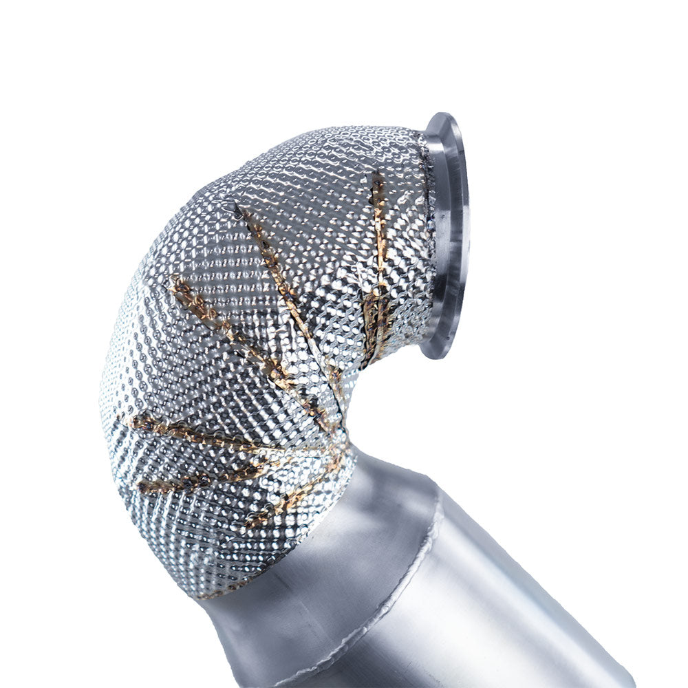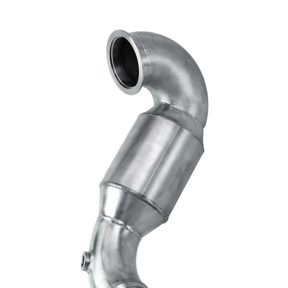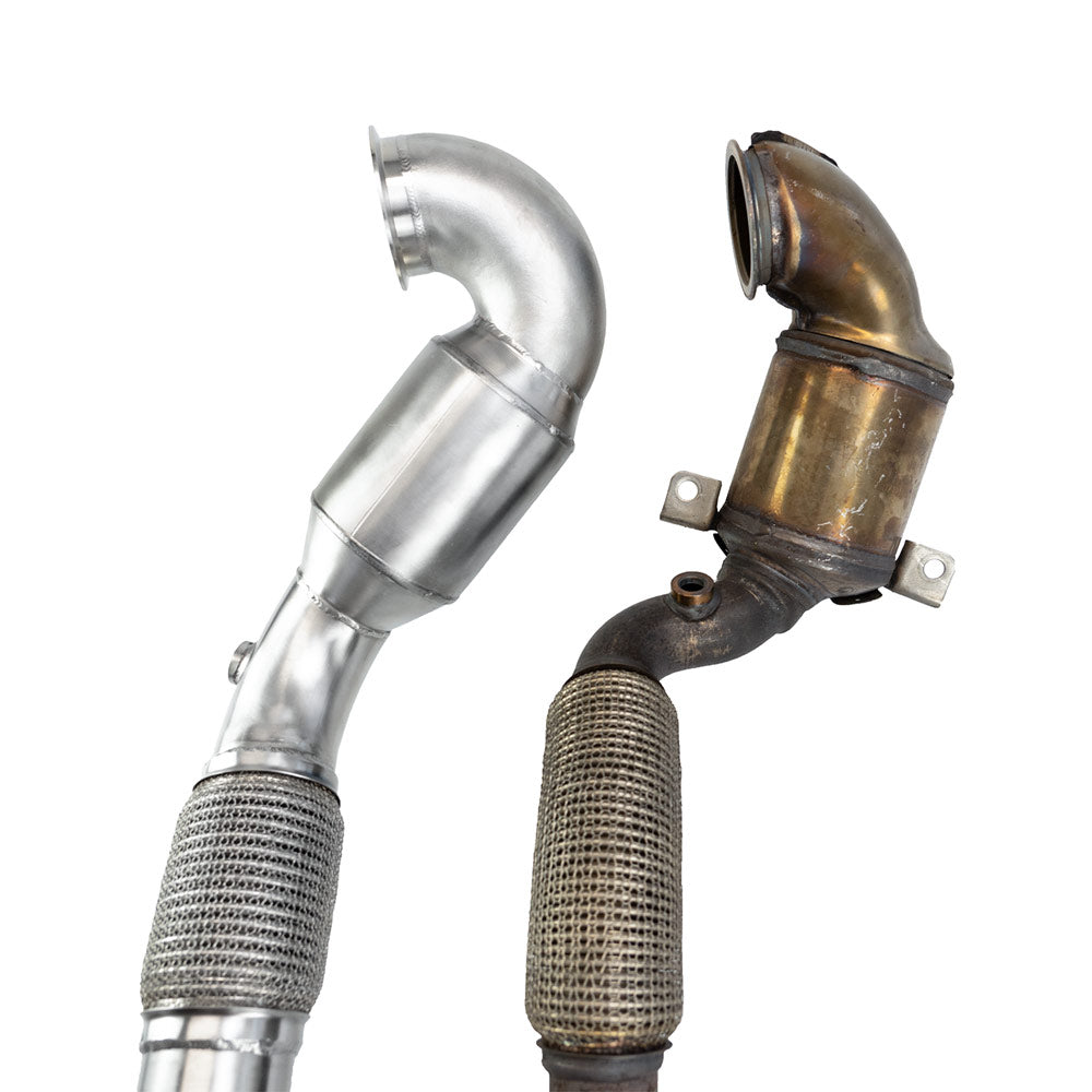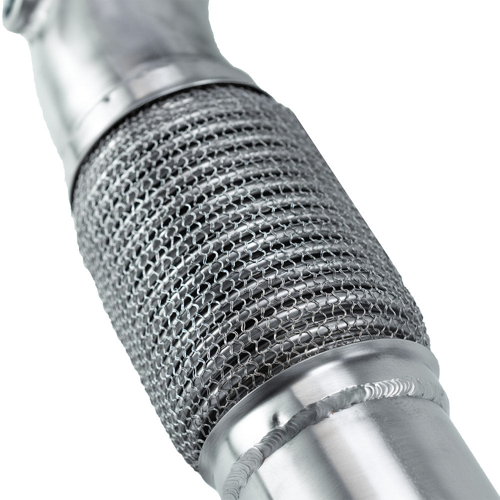Die Downpipe ist ideal für Serien- sowie leistungsgesteigerte Fahrzeuge. Je nach Konfiguration ist sie mit einem HJS 200 Zellen Sportkatalysator erhältlich, der über eine ECE-Betriebserlaubnis verfügt und somit eintragungsfrei gefahren werden kann. Alternativ stehen auch Motorsportvarianten ohne Zulassung zur Auswahl. Eine mitgelieferte Edelstahlreduzierung ermöglicht die einfache Anpassung an Serienanlagen oder 3" Abgassysteme. Tipp: Bei Fahrzeugen mit Schaltgetriebe wird der Einsatz einer verstärkten Drehmomentstütze empfohlen, um Kontaktgeräusche aufgrund des größeren Rohrdurchmessers zu vermeiden.