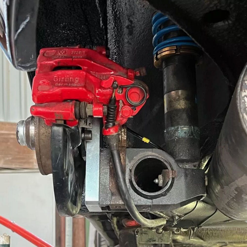 Technik: Unsere Achsversatzplatten werden einfach an die Original-Achsaufnahme geschraubt, wodurch die Achszapfen problemlos um 70 mm weiter oben angebracht werden können. Dies bewirkt, dass das Rad um 70 mm weiter im Radkasten steht. Obwohl die Adapterplatte aus hochfestem Stahl gefertigt ist, sollte sie jedoch nur für Show- und Shine-Fahrzeuge verwendet werden.