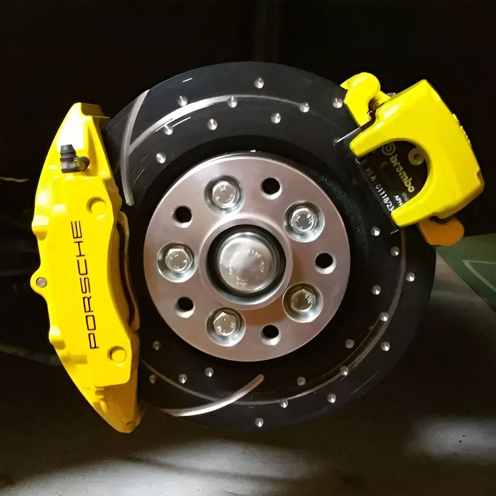 Die Porsche Sättel werden an die Hydraulik deines Fahrzeugs angeschlossen und sorgen für eine enorme Bremskraft. Da diese Sättel keine Handbremsfunktion haben, verwenden wir zusätzlich die Handbremssättel vom Audi S3 bzw. Golf 4 R32. Der Hydraulikanschluss wird dabei mit einem Blindstopfen verschlossen, sodass diese Sättel nur als Handbremse dienen.