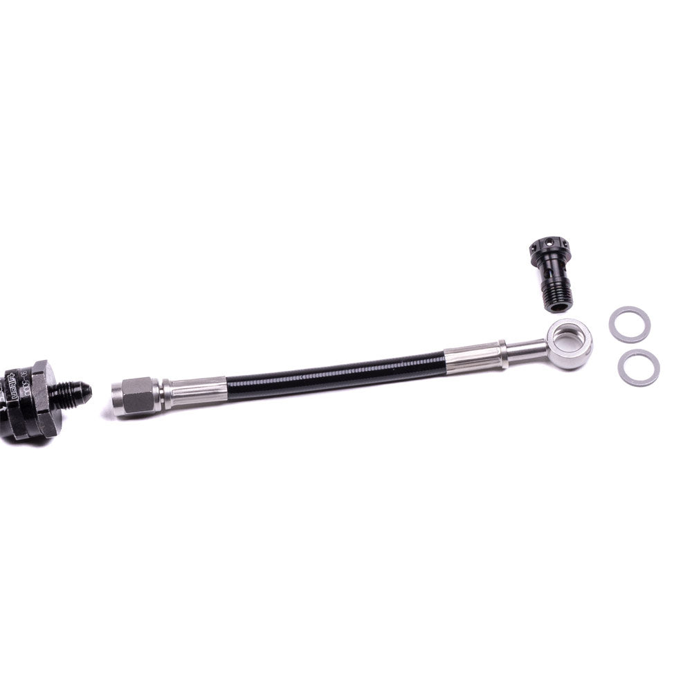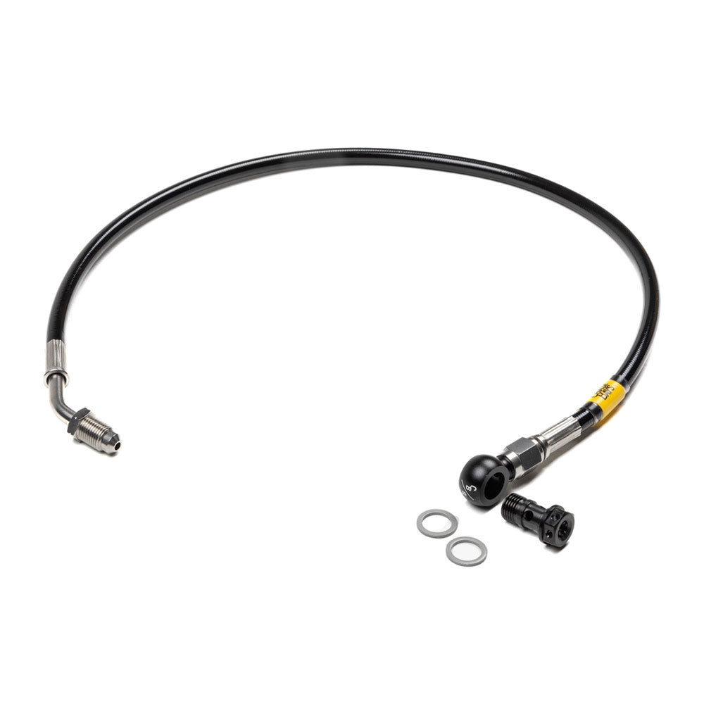Für ein besseres Pedalgefühl, saubere Kupplungsbetätigung und optimierte Optik empfehlen wir das Upgrade auf einen Tilton Kupplungsgeberzylinder, den wir ebenfalls anbieten. Der einzige Unterschied liegt in den Anschlussgewinden des Kupplungsgeberzylinders: Der originale Geberzylinder hat M10x1.0, während der Tilton 3/8-24 verwendet. Dieses Kit enthält den M10 Banjo-Bolzen, und falls der Tilton Geberzylinder bei uns gekauft wird, liegt der passende 3/8-24 Banjo-Bolzen bei. Einfach den richtigen Banjo-Bolzen einsetzen – und die Leitung passt perfekt.
