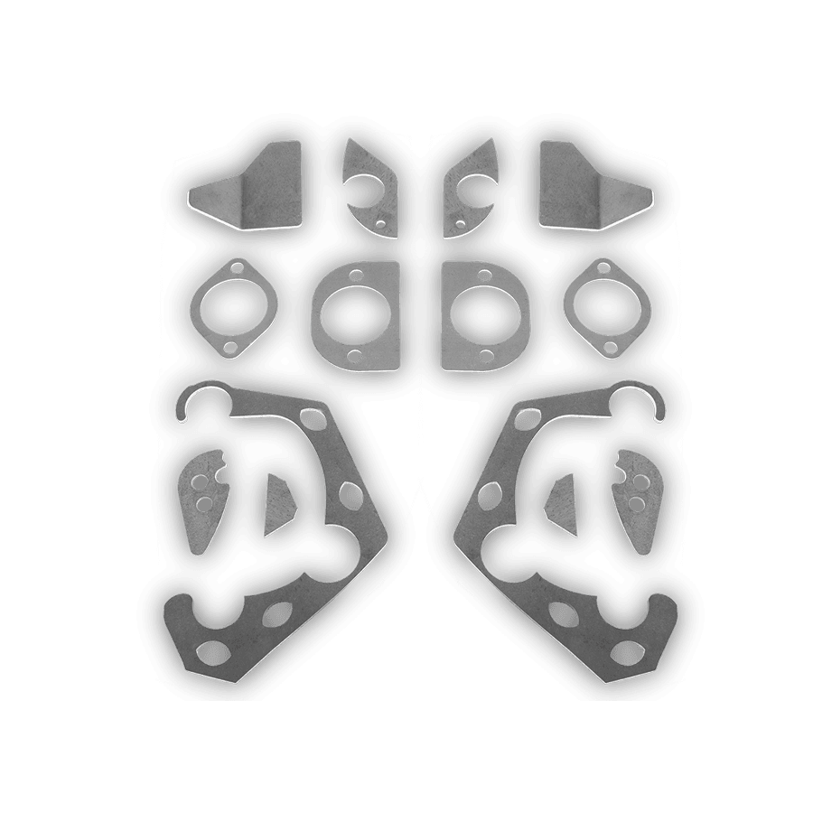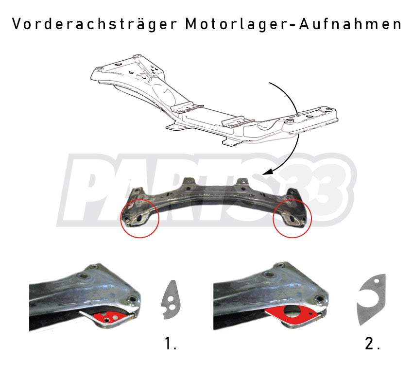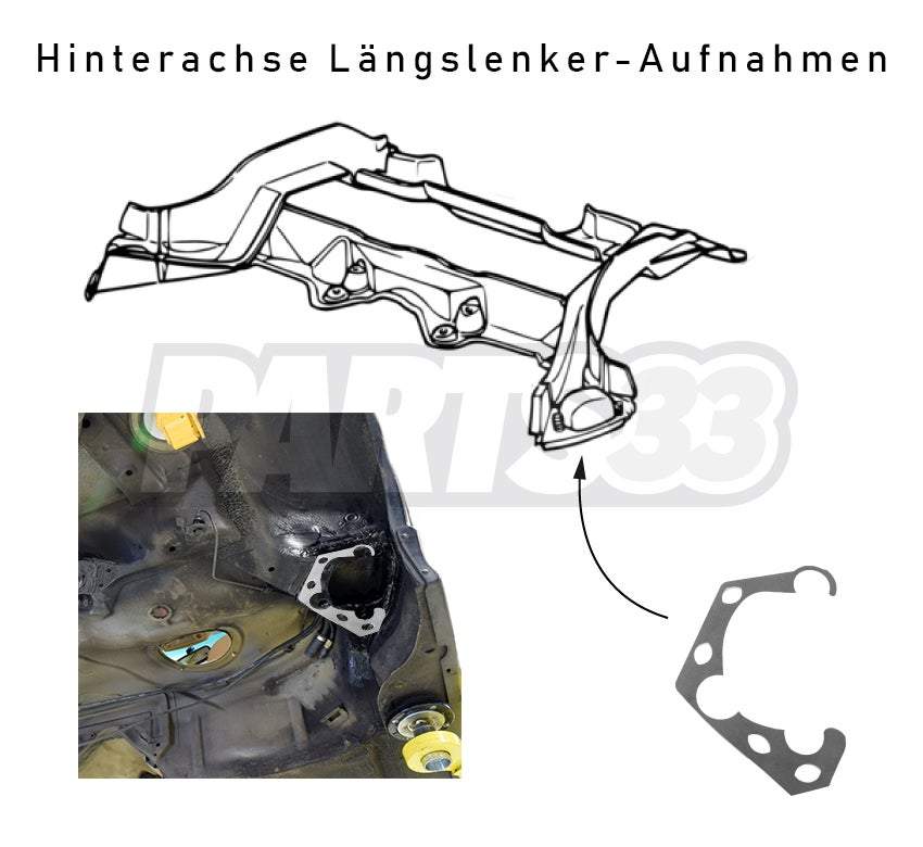 Das Set beinhaltet lasergeschnittene Verstärkungsbleche für die hinteren Stoßdämpferaufnahmen, die Stabilisatoraufnahmen am Hinterachsträger, die Motorlageraufnahmen am Vorderachsträger sowie die Längslenkeraufnahmen in den unteren Längsträgern.