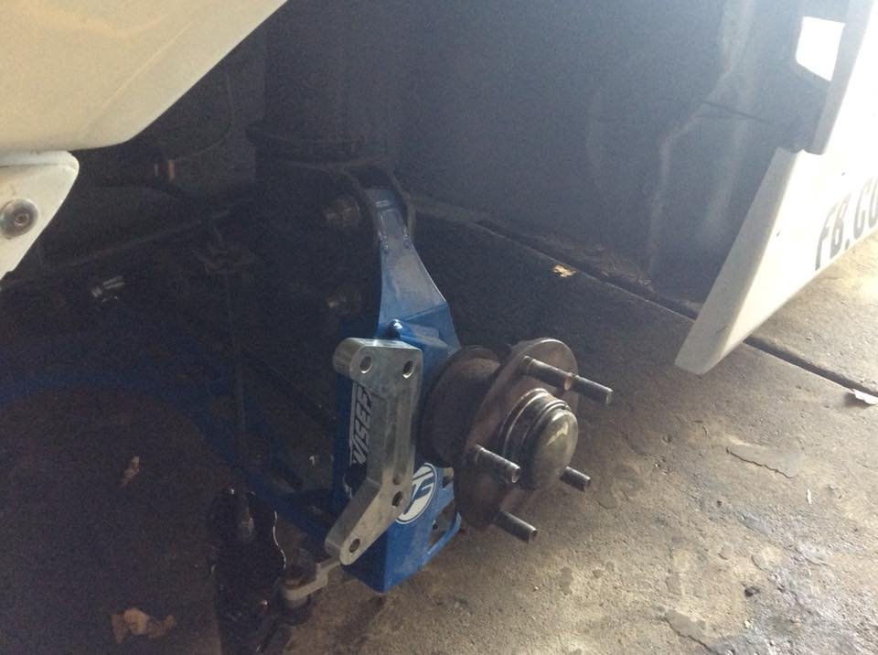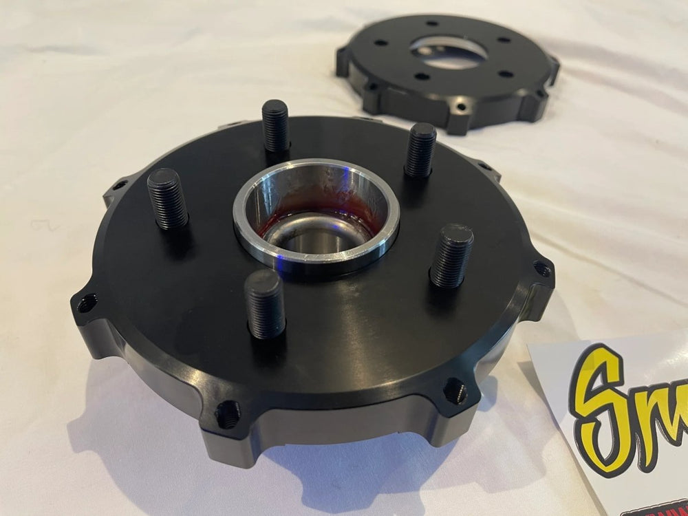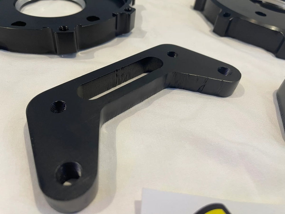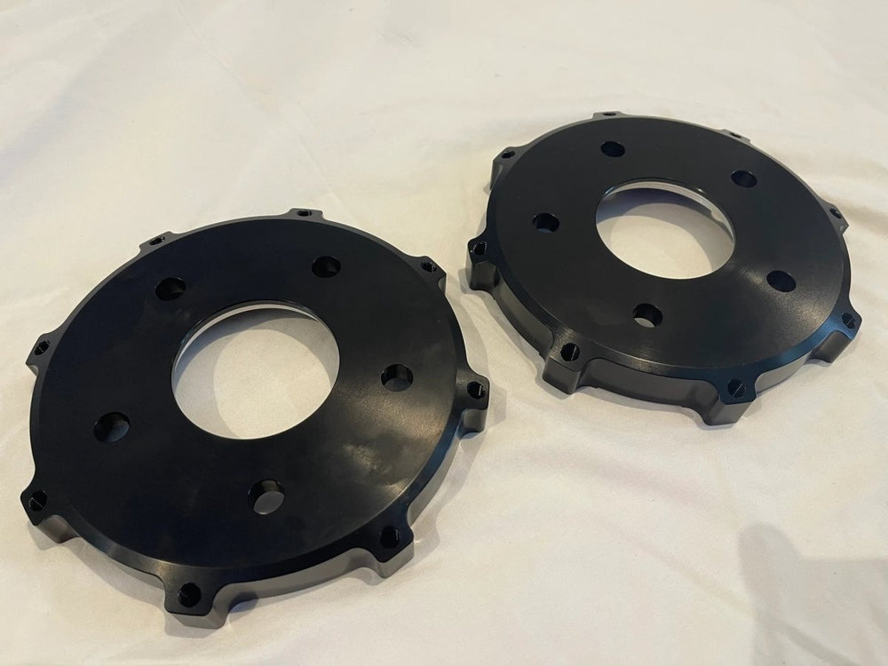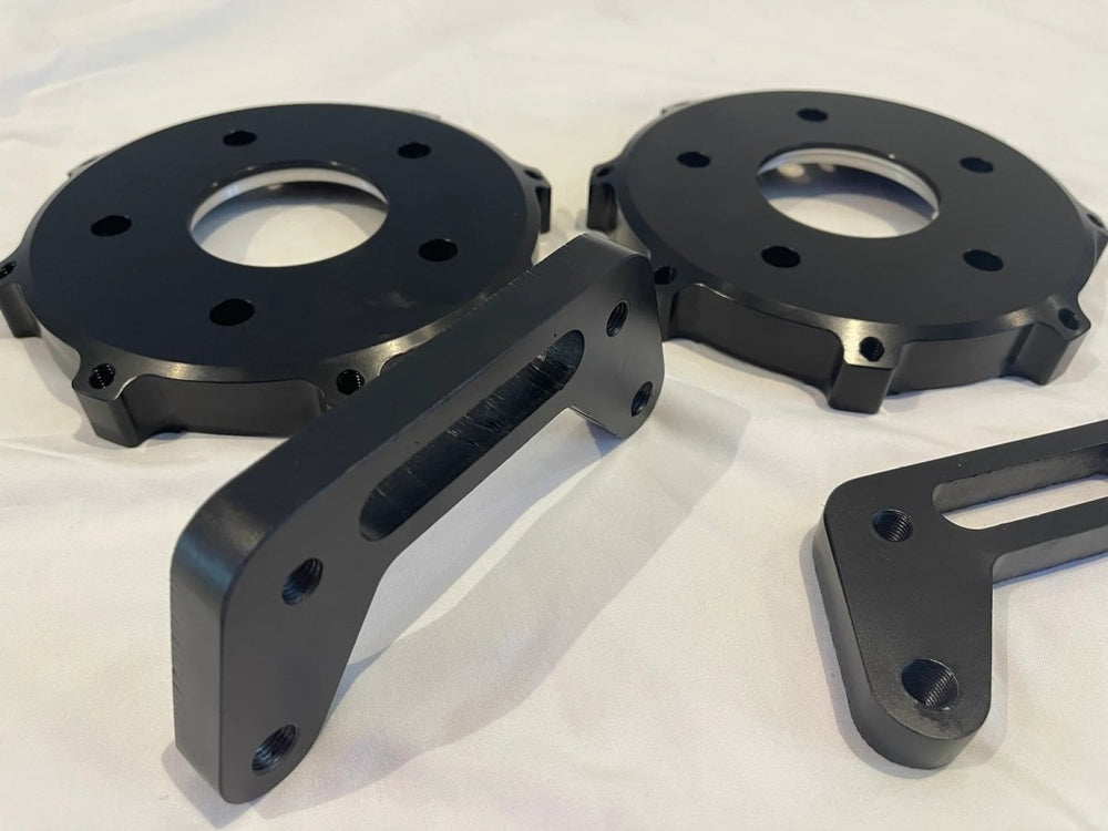 Die Basis-Version besteht aus 1045 Stahlbremsadaptern und soliden Billet 6061 Bremsscheibenkappen, während das Rennkit aus Aluminium Billet 6061 Bremsadaptern (jeweils 200 Gramm leichter) und Billet 6061 gebohrten Bremsscheibenkappen (jeweils 100 Gramm leichter) besteht. Eine Reduzierung des ungefederten Gewichts verbessert das Fahrverhalten, da es weniger Arbeit für Stoßdämpfer und Federn benötigt, um die Reifen auf der Straße zu halten.