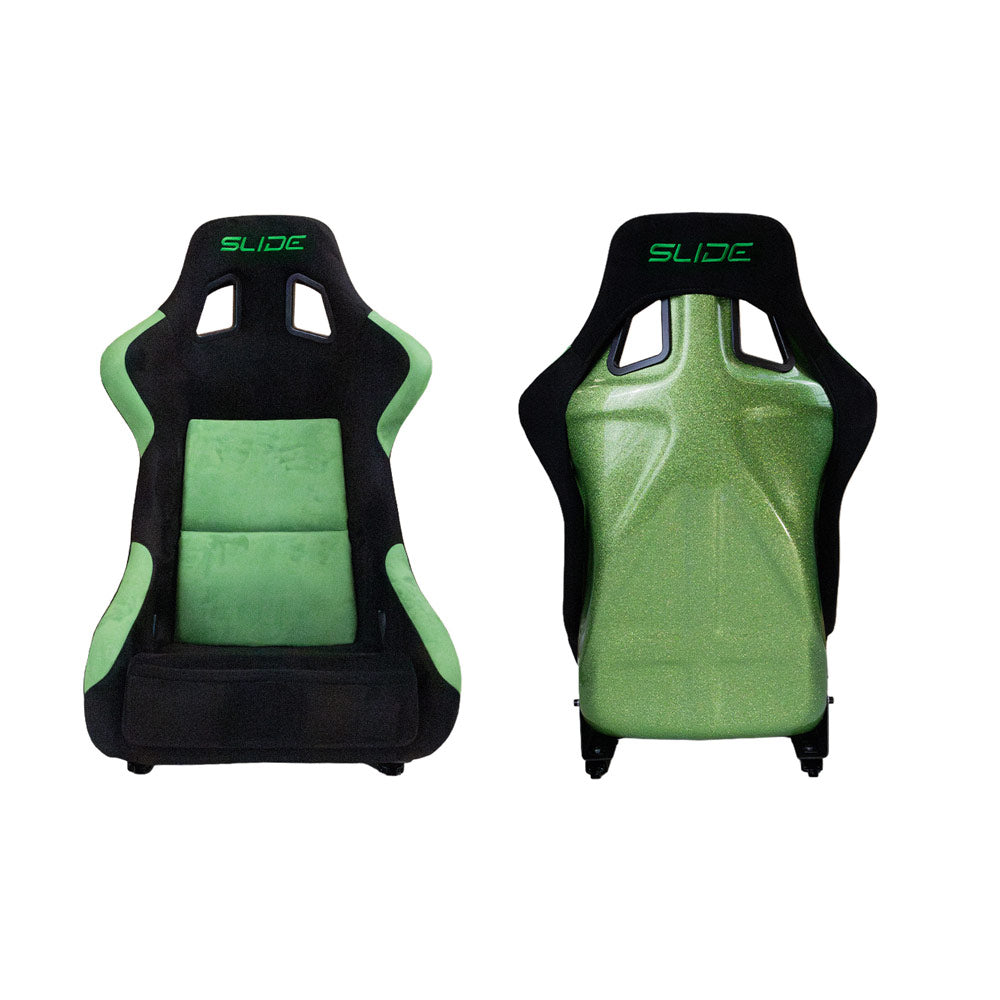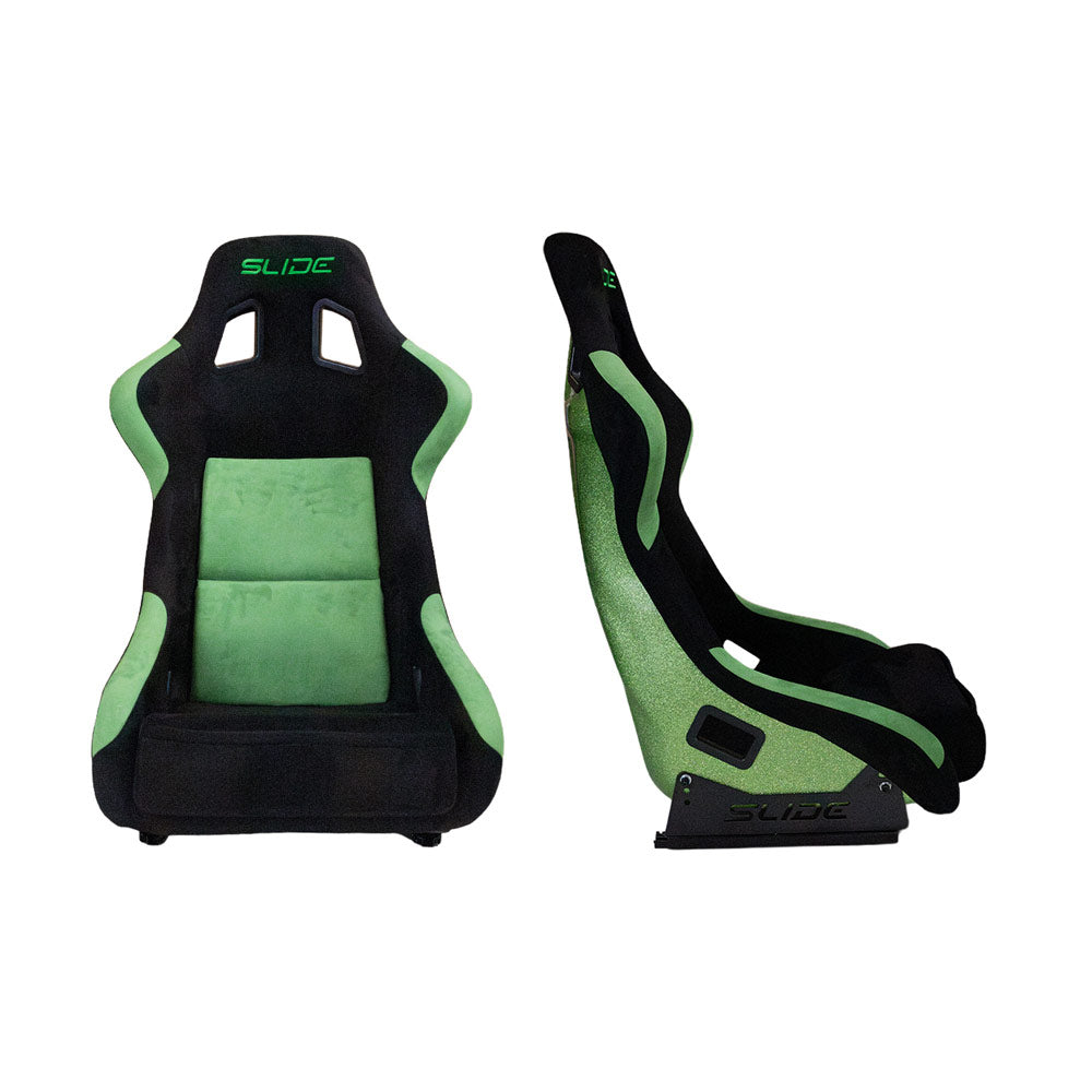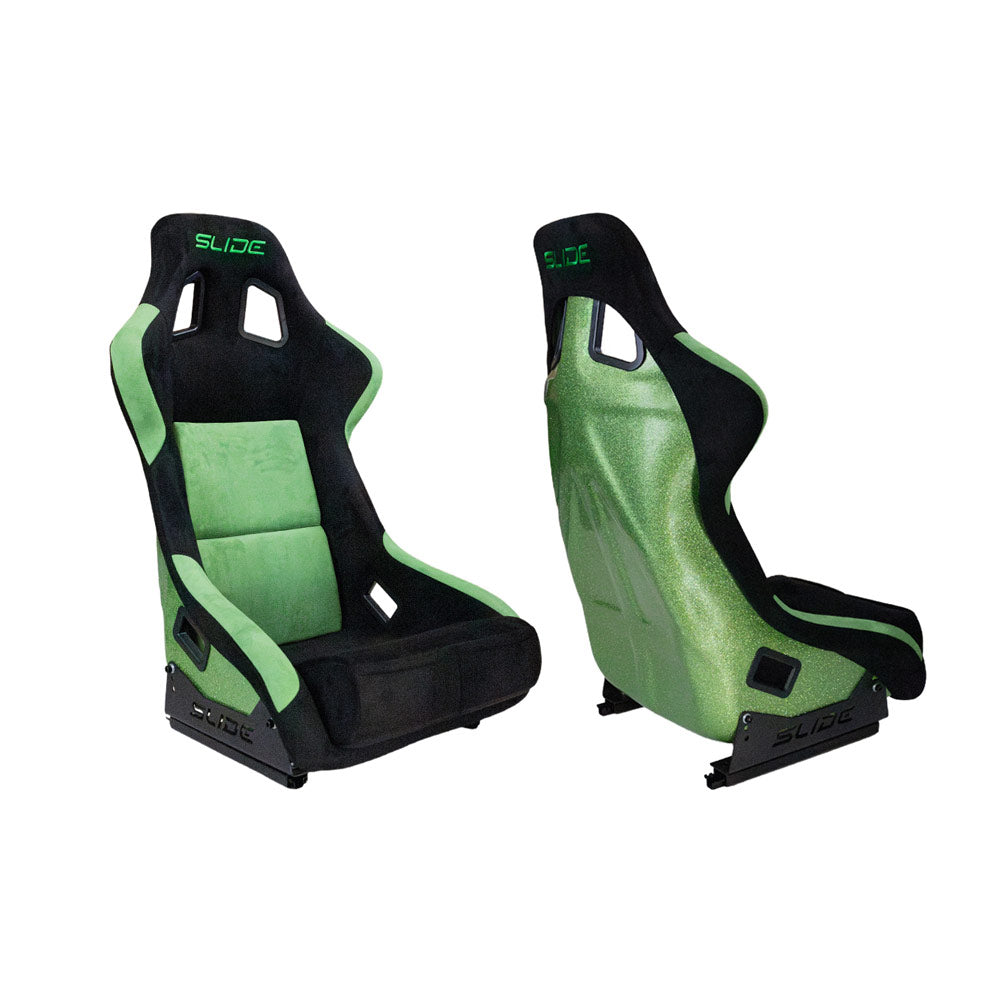 Der SLIDE KS2 Premium Rennsitz in hochwertigem grün-schwarzem Wildleder und mit markanter grüner Glitter-Rückseite kombiniert kompromisslose Rennsporttechnik mit einem auffälligen, modernen Design. Perfekt für Trackday-Fahrer oder Performance-Umbauten, bei denen Funktionalität und Optik gleichermaßen überzeugen sollen.