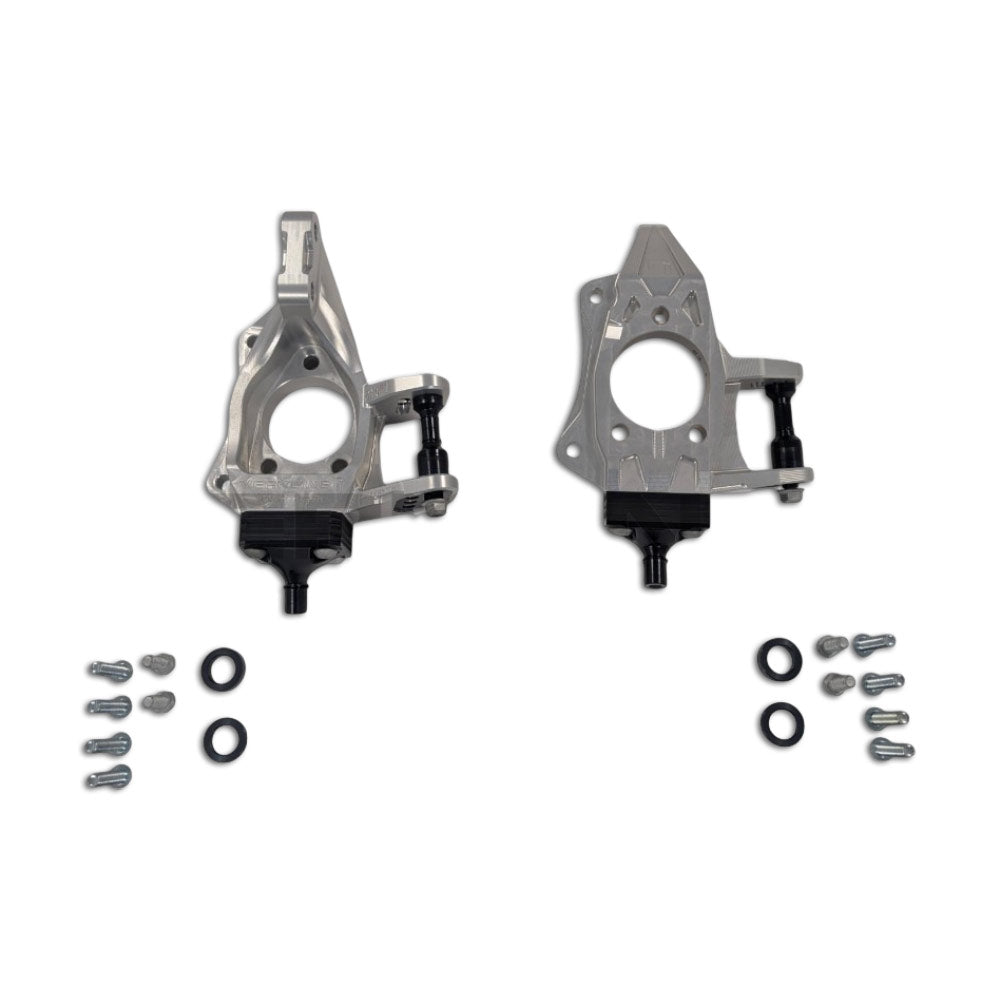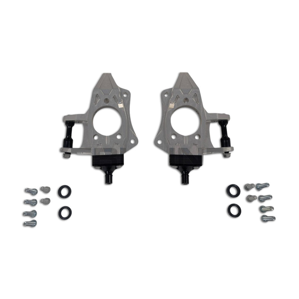 Lieferumfang: 2x CNC-gefräste, eloxierte Aluminium-Uprights (links & rechts), 2x hochfeste, bearbeitete Stahlaufnahmen für den unteren Querlenker, Satz Rollcenter- & Camber-Gain-Einstellplatten, 4x Ackermann- & Lenkübersetzungs-Einstellplatten, Satz Bump-Steer-Einstellscheiben, Satz Buchsen zur Einstellung des maximalen Lenkeinschlags, Kompletter Montageschraubensatz, Gedruckte Installationsanleitung (16 Seiten)