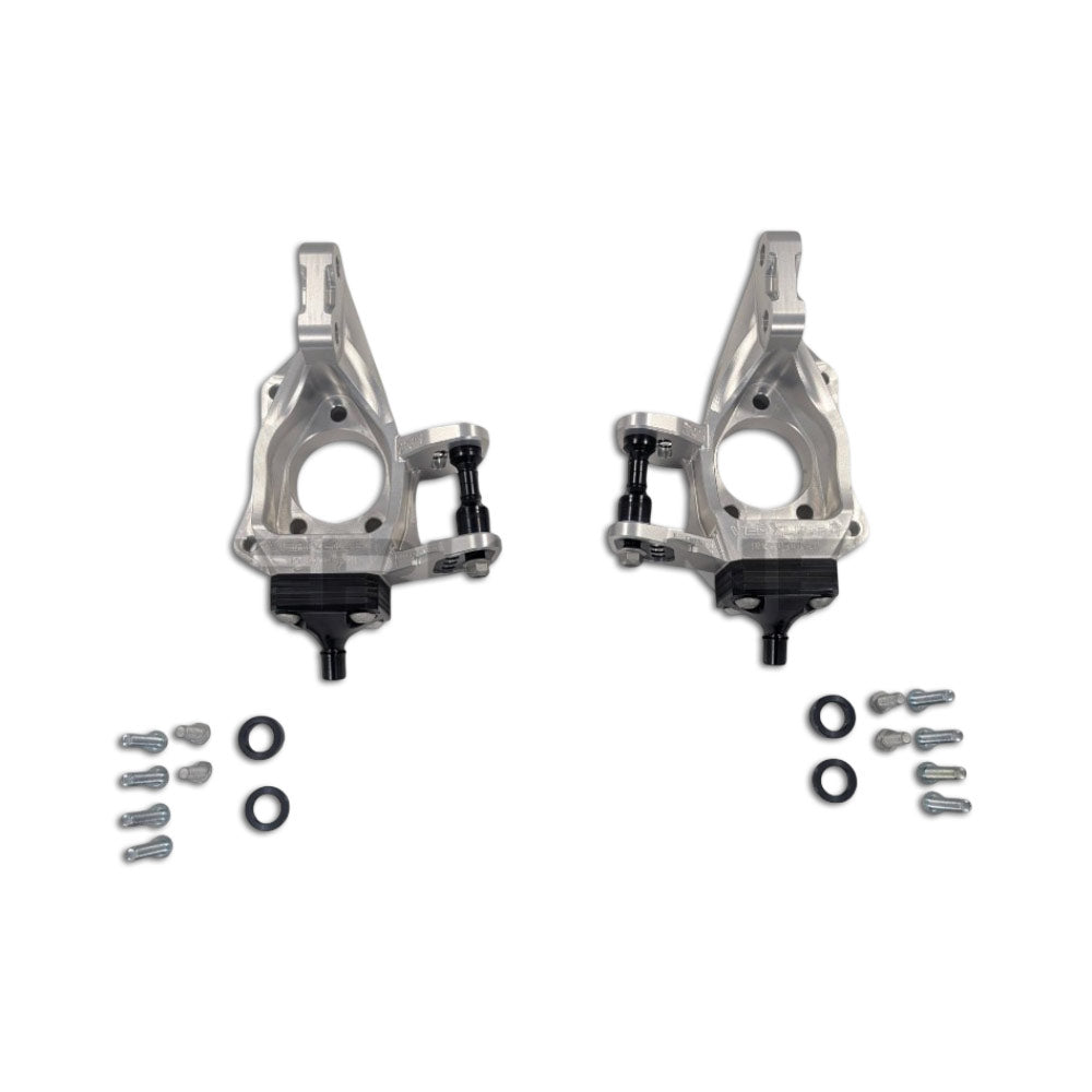 Die Achsschenkel verfügen über eine Double-Shear-Aufnahme der Spurstangen, was die Steifigkeit erhöht und Spiel unter hoher Belastung minimiert. Trotz der Motorsport-Ausrichtung bleiben wichtige OEM-Funktionen erhalten – unter anderem die Kompatibilität mit dem originalen Raddrehzahlsensor, sodass moderne Assistenz- und Sicherheitssysteme weiterhin genutzt werden können.