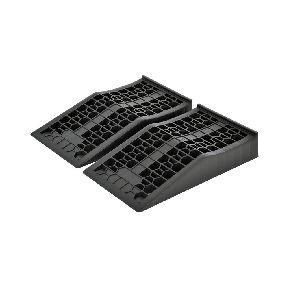 Dank eines flachen Auffahrwinkels von 17 Grad und einer Anhebung um 65 mm ermöglichen die Rampen einen einfachen Zugang für Wagenheber unter dem Frontträger oder an der Seitenkante. Die integrierten Gummipads an der Unterseite verhindern ein Verrutschen beim Auffahren, während die gebogene Plattform Druckspitzen am Reifen reduziert – ideal auch für längere Standzeiten.