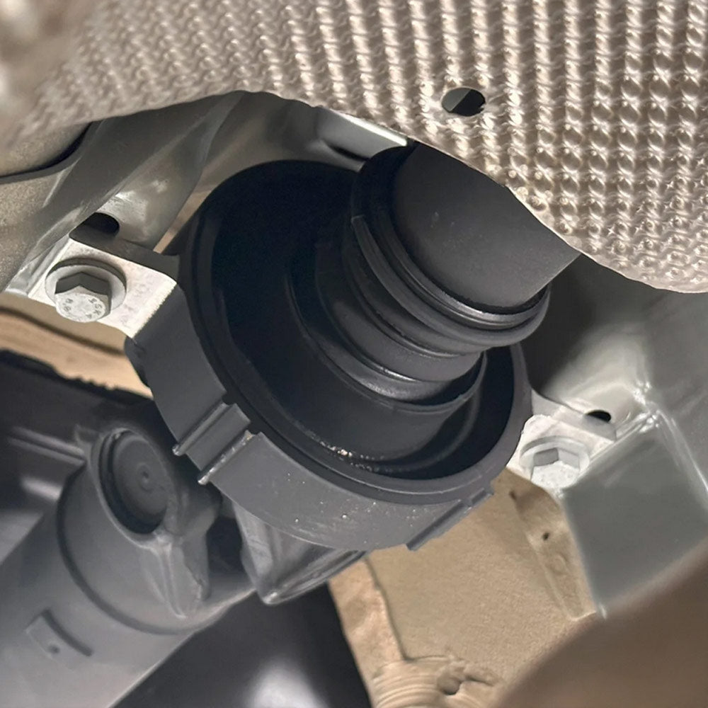 Die Montage ist denkbar einfach: Das zweiteilige Design umschließt das serienmäßige Lager ohne Ausbau der Kardanwelle. Lediglich der originale Träger muss entfernt werden – dafür wird ein Schneidwerkzeug benötigt.