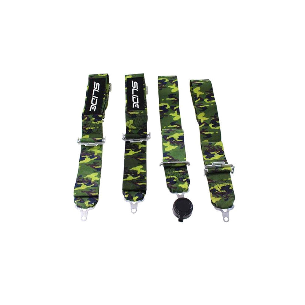 Der SLIDE Quick 4-Punkt Sport-Sicherheitsgurt in Camouflage besteht aus Textil und teilweise aus Verbundmaterialien.