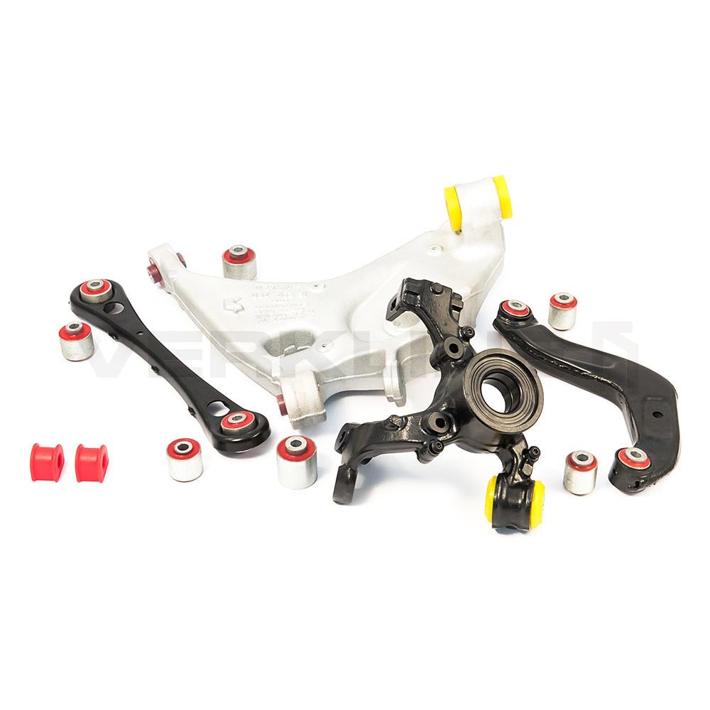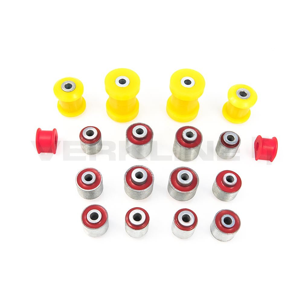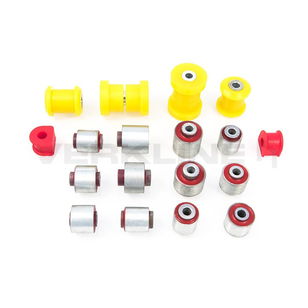 Lieferumfang: 2x Hintere Stabibuchse 22mm, 4x hintere Buchse für oberen Querlenker, 2x hintere Buchse für hinteren unteren Querlenker, 2x vordere Hülse für hinteren unteren Querlenker, 2x Buchse für hinteren unteren Querlenker, 2x innere Buchse für hinteren Querlenker, 2x äußere Buchse für hinteren Querlenker, 2x PU-Buchseneinsatz für den hinteren Achsschenkel, Fett zum Einpassen der Buchsen